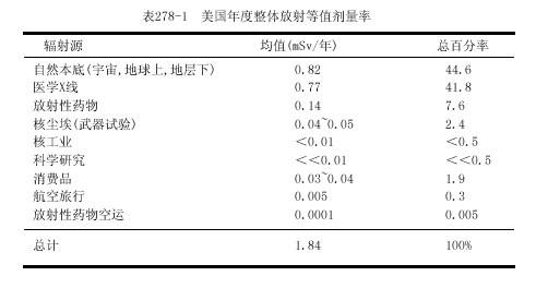 常用的測(cè)量單位是倫琴,戈瑞(Gy)和希沃特(Sv).倫琴(R)是空氣中x或γ電離輻射的計(jì)量單位,戈瑞是被各組織或物質(zhì)吸收的能量計(jì)量單位,它可應(yīng)用于各類輻射.R和厘戈瑞(cGy)基本上是相等的.在說明生物學(xué)效應(yīng)時(shí),Sv與經(jīng)質(zhì)量因子校正的Gy相等.因?yàn)閷?duì)一定量的能量而言,不同類型的輻射可產(chǎn)生不同的生物學(xué)效應(yīng);例如,中子有較大的效應(yīng).對(duì)X和γ輻射,Sv與Gy相等.在現(xiàn)代術(shù)語中Gy和Sv已替代拉德(rad)和雷姆(rem),Gy=100rad,Sv=100rem.在非專業(yè)刊物中常常將輻射分為低水平輻射(0.2~0.3Gy)和高水平輻射(>0.3Gy).而醫(yī)學(xué)劑量一般為<0.05Gy,而且常常<0.01Gy.地球及其大氣的本底放射活性水平很低,而不能測(cè)知其效應(yīng)(表278-1).